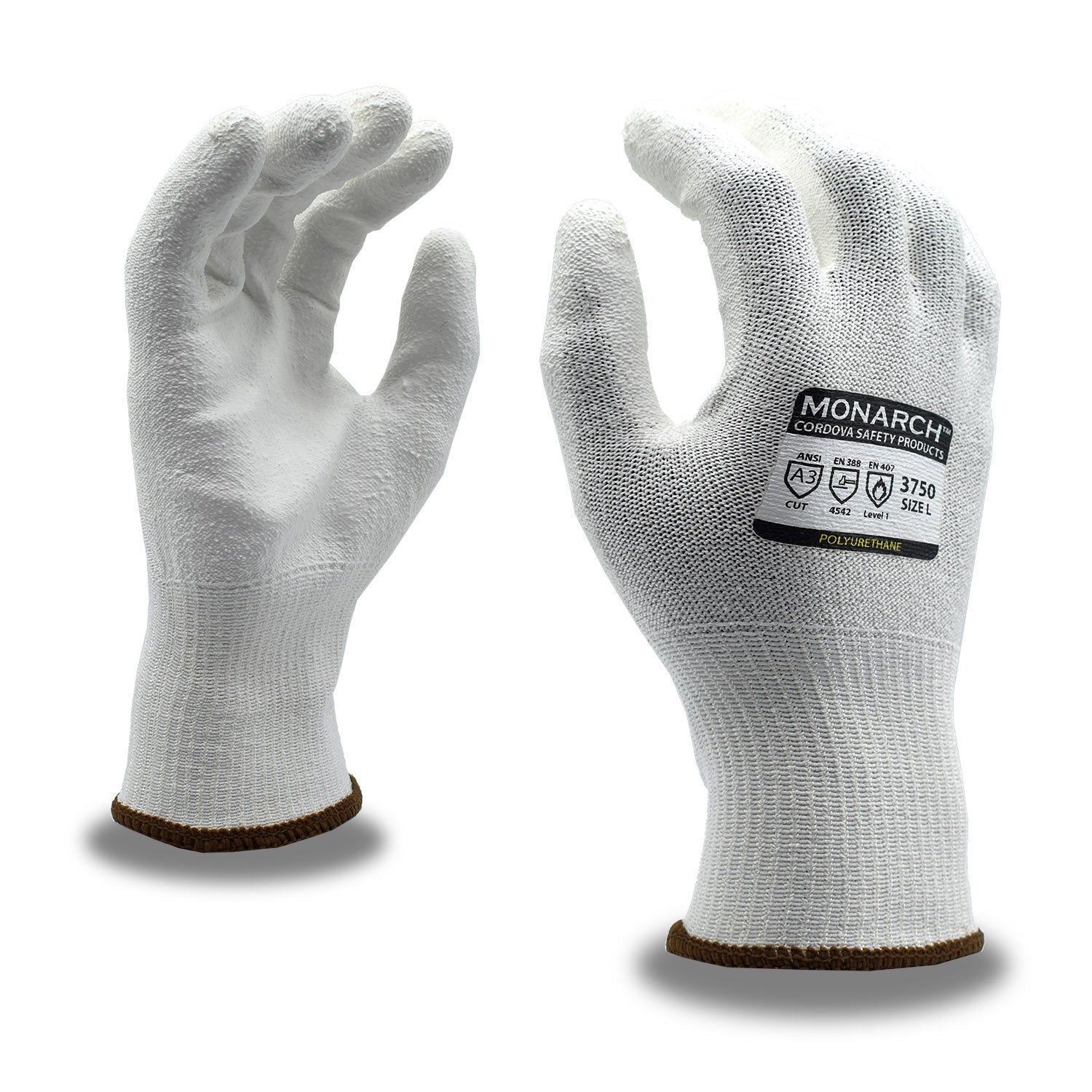 Cordova Safety Products-brand MONARCHâ„¢ high-performance, engineered fiber gloves are constructed of a versatile, multi-filament yarn that combines high-strength fiber, fiberglass and synthetic fibers to provide excellent abrasion, cut and contact-heat resistance. The MONARCH PUâ„¢ glove features a white, 13-gauge, spun high-performance shell, white polyurethane (PU) palm coating, and an A3 cut level. MONARCHâ„¢ gloves are easy to launder and unaffected by chlorine bleach and UV light.